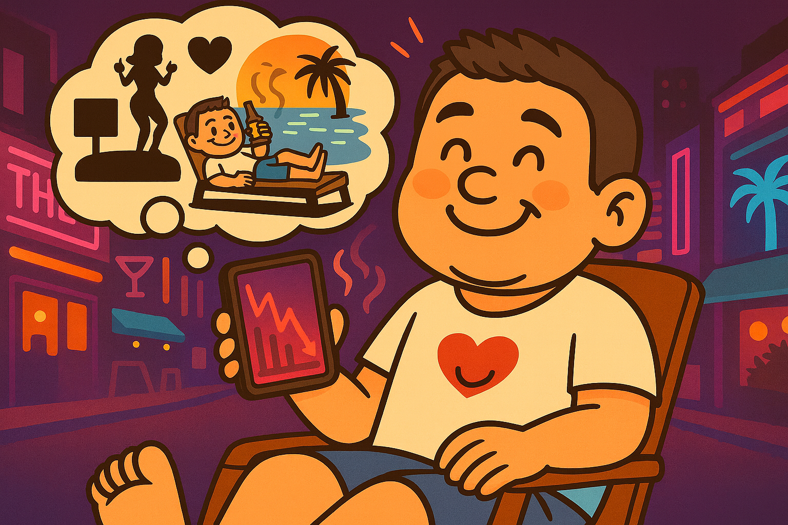 「正直に言うとやな、わしの頭の中にはいつも『気に入ったねーちゃんを連れて帰って、翌日はホテルのプールでバカンス気分』って妄想が繰り返しループするんや。現金は消えたけど、妄想はタダや。朝陽を浴びながら『昨夜はすごかったな』って笑い合う自分を想像しては、またチャートを開く腐ったループが始まるんや。」